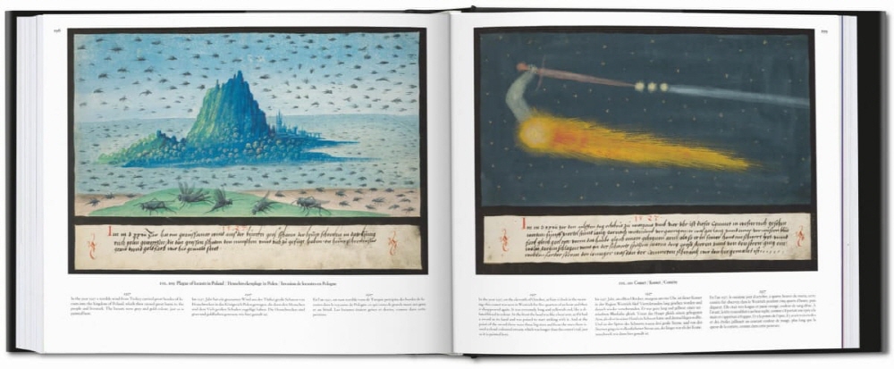 The mesmerizing images deal with both biblical and folkloric tales, depicting stories from the Old Testament and Book of Revelation as well as events that took place in the immediate present of the manuscript¡¯s author. From shooting stars to swarms of locusts, terrifying monsters to fatal floods, page after page hypnotizes with visions alternately dreadful, spectacular, and even apocalyptic.