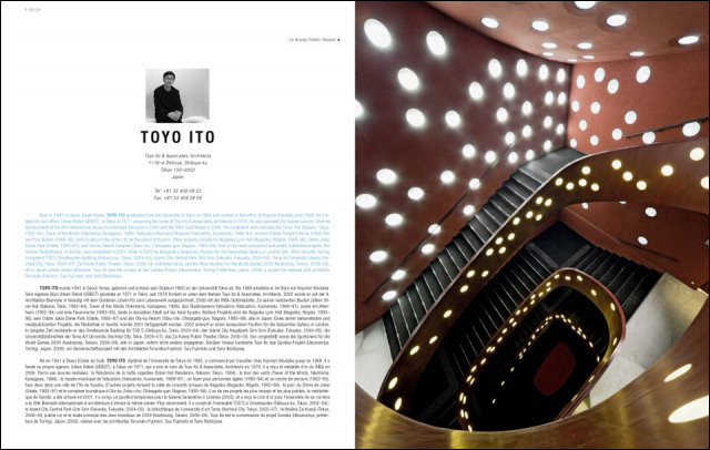 Ambasz, Aravena, Architektur und Landschaft, Asymptote, Atelier-Den/Inahara, Balmond, Barclay, Barkow Leibinger, Baumschlager Eberle, BIG, Boeri, Byoung-soo Cho, Calatrava, Costa, Elliott, Endo, France-Lanord, François, Fujimori, Fujimoto, Gustafson Porter, Hadid, Herreros, Herzog & de Meuron, HHF, Holl, Information Based Architecture, International Polar Foundation, IROJE KHM, Ishigami, Ito, James Corner Field Operations/DS+R, Jensen & Skodvin, Kalhöfer-Korschildgen, KHR, LAAC, López Mónica Rivera, Greg Lynn FORM, Made in Sàrl, Maki, Morphosis, Moss, Nobis, NOX, Ohtake, OMA*AMO, Paredes Pedrosa, Perrault, Piano, Plasma Studio, Ricciotti, Rich Rotor, Sambuichi, SANAA, del Sol, SOM, Splitterwerk, Sugimoto, Supersudaka, Takasaki, Tokujin, de vylder vinck taillieu