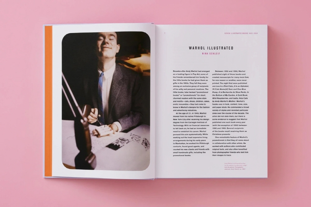 In 1950s New York, before he became one of the most famous names of the 20th century, Andy Warhol was already a skilled and successful commercial artist. During this time, as part of his strategy to woo clients and forge friendships, he created seven handmade artist¡¯s books, reserved to his most valued contacts. These featured personal, unique drawings and quirky texts revealing his fondness for—among other subjects—cats, food, myths, shoes, beautiful boys, and gorgeous girls.