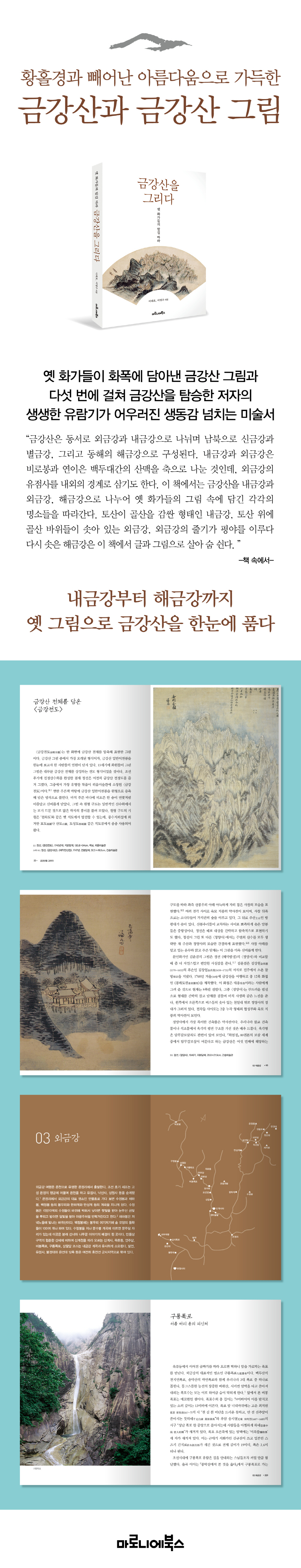 ±Ý°­»êÀº µ¿¼­·Î ¿Ü±Ý°­°ú ³»±Ý°­À¸·Î ³ª´µ¸ç ³²ºÏÀ¸·Î ½Å±Ý°­°ú º°±Ý°­, ±×¸®°í µ¿ÇØÀÇ ÇØ±Ý°­À¸·Î ±¸¼ºµÈ´Ù. ³»±Ý°­°ú ¿Ü±Ý°­Àº ºñ·ÎºÀ°ú ¿¬ÀÌÀº ¹éµÎ´ë°£ÀÇ »ê¸ÆÀ» ÃàÀ¸·Î ³ª´« °ÍÀε¥, ¿Ü±Ý°­ÀÇ À¯Á¡»ç¸¦ ³»¿ÜÀÇ °æ°è·Î »ï±âµµ ÇÑ´Ù. ÀÌ Ã¥¿¡¼­´Â ±Ý°­»êÀ» ³»±Ý°­°ú ¿Ü±Ý°­, ÇØ±Ý°­À¸·Î ³ª´©¾î ¿¾ È­°¡µéÀÇ ±×¸² ¼Ó¿¡ ´ã±ä °¢°¢ÀÇ ¸í¼ÒµéÀ» µû¶ó°£´Ù. Åä»êÀÌ °ñ»êÀ» °¨½Ñ ÇüÅÂÀÎ ³»±Ý°­, Åä»ê À§¿¡ °ñ»ê ¹ÙÀ§µéÀÌ ¼Ú¾Æ ÀÖ´Â ¿Ü±Ý°­, ¿Ü±Ý°­ÀÇ ÁٱⰡ Æò¾ß¸¦ ÀÌ·ç´Ù ´Ù½Ã ¼ÚÀº ÇØ±Ý°­Àº ÀÌ Ã¥¿¡¼­ ±Û°ú ±×¸²À¸·Î »ì¾Æ ¼û ½®´Ù. 1998³âºÎÅÍ 2018³â±îÁö ±Ý°­»êÀ» ޽ÂÇÑ ÀúÀÚ´Â Á÷Á¢ Ä«¸Þ¶ó·Î ´ãÀº ½Ç°æ À̹ÌÁö¸¦ Á¦½ÃÇϰí, ±×°÷ÀÌ ¿¾ È­°¡µéÀÇ ¼Õ¿¡¼­ ¾î¶»°Ô Àçź»ýÇß´ÂÁö¸¦ º¸¿©ÁØ´Ù.