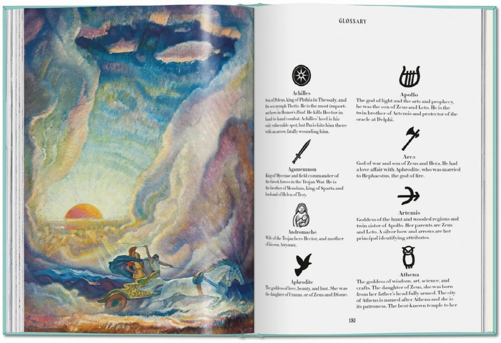 This edition contains 21 of the most famed episodes from the Trojan War, the subsequent wanderings of Odysseus, and his long-awaited return to Ithaca. The texts are carefully compiled from the seminal work Sagen des klassischen Altertums (Gods and Heroes: Myths and Epics of Ancient Greece) by Gustav Schwab (1792–1850), and strikingly illustrated by 15 artists, among them outstanding representatives of the Golden Age of Book Illustration and the Arts and Crafts Movement, including Walter Crane (1845–1915), William Russell Flint (1880–1969), Newell Convers Wyeth (1882–1945), and Virginia Frances Sterrett (1900–1931).