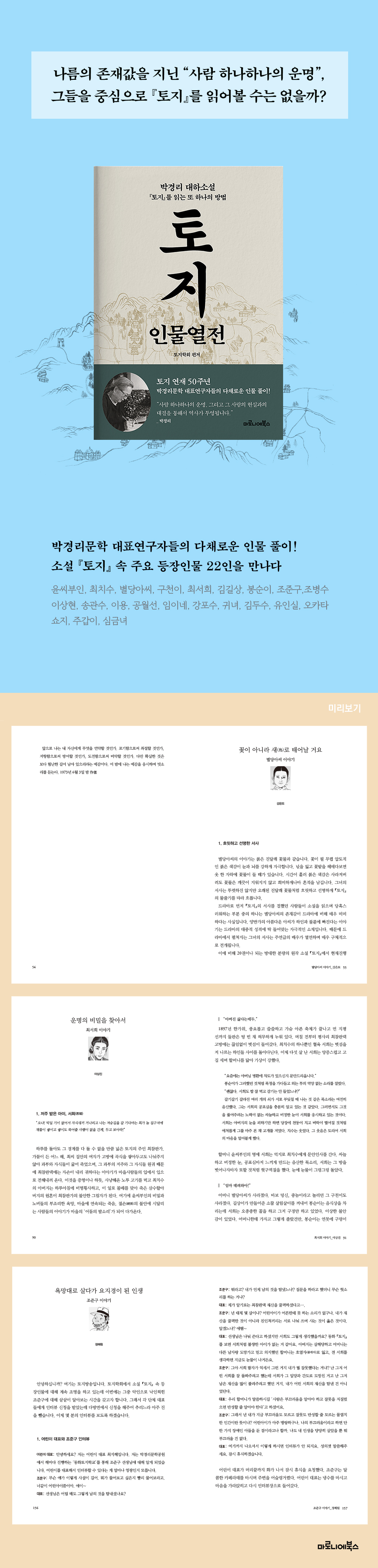 500ÀÚ ¿ä¾àÇѱ¹ÀÎÀÌ °¡Àå ÁÁ¾ÆÇÏ´Â ¼Ò¼³·Î ¼Õ²ÅÈ÷´Â ¹Ú°æ¸® ´ëÇϼҼ³ ¡ºÅäÁö¡»¿¡´Â 700¿© ¸í¿¡ ´ÞÇÏ´Â Àι°µéÀÌ µîÀåÇÑ´Ù. ÀÌ °¡¿îµ¥ 22¸íÀÇ °³¼º ÀÖ´Â µîÀåÀι°À» ¹Ú°æ¸® ¹®ÇÐ ´ëÇ¥ ¿¬±¸ÀÚµéÀÌ ´Ù¾çÇÑ ÇØ¼³·Î <ÅäÁö Àι°¿Àü>¿¡¼ ¸¸³¯ ¼ö ÀÖ´Ù. À±¾¾ºÎÀÎ, ÃÖÄ¡¼ö, º°´ç¾Æ¾¾ µî ÀÛǰ ÃÊ¹Ý Á¸Àç°¨À» µå·¯³½ Àι°ºÎÅÍ ÃÖ¼Èñ, ±è±æ»ó, Á¶Áر¸, ±èµÎ¼ö µî ÈĹݺαîÁö ±× ±ËÀûÀ» ã¾Æº¼ ¼ö Àִ ij¸¯ÅͱîÁö ´Ù¾çÇÏ´Ù. °¢ÀÚÀÇ °îÀý ¸¹°í µå¶ó¸¶Æ½ÇÑ »î¸¸ÅÀ̳ª À̵éÀÇ À̾߱⸦ Ç®¾î°¡´Â ÇÊÀÚµéÀÇ ½Ãµµ´Â ´Ùä·Ó´Ù. Àι°ÀÇ Æ¯Â¡À» ±×·Áº¼ ¼ö ÀÖ´Â ÀλóÀûÀÎ Àå¸éµéÀ» ¸Æ¶ôº°·Î Á¦½ÃÇϱ⵵ Çϰí, ÇØ´ç Àι°¿¡°Ô °íÇÏ´Â ±ÛÀ» ¾²°Å³ª µîÀåÀι° º»ÀÎÀÌ ¹Ú°æ¸® ÀÛ°¡¿¡°Ô ÆíÁö¸¦ ¶ç¿ì±âµµ ÇÑ´Ù. ½º¹« ÀåÀÇ ±Û¿¡¼ »ö´Ù¸£°Ô ÆîÃÄÁø ÇÊÄ¡´Â ÀÌ Ã¥À» Àд ¶Ç ´Ù¸¥ Àç¹ÌÀÌ´Ù. ¼Ò¼³À» ÀÌ¹Ì ÀÐÀº À̵鿡°Õ ±×¸³´ø ¿À·£ Ä£±¸¿Í ´Ù½Ã ¸¸³ª´Â Áñ°Å¿òÀ», ÀÌÁ¦ ÀÐÀ¸·Á´Â À̵鿡°Ô´Â <ÅäÁö>¶ó´Â Å« °À» °Ç³Ê±â Àü ¾òÀº ¡®¹è ÇÑ Ã´¡¯ °°Àº µçµçÇÔÀ» ÁÙ °ÍÀÌ´Ù.