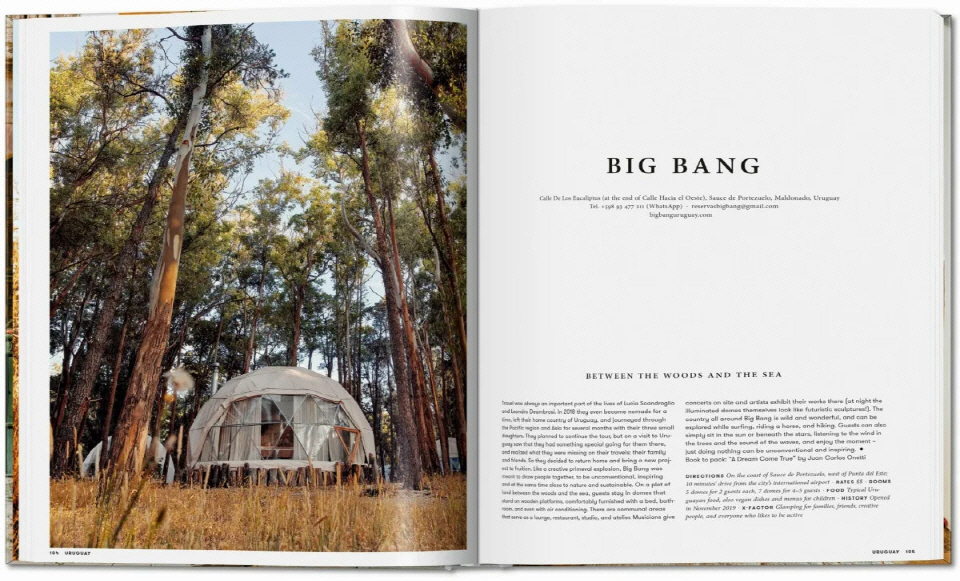 The places to stay shown here include the Anavilhanas Jungle Lodge in the Brazilian Amazon and the Uxua on the beach of Trancoso, for which a Dutch designer has transformed historic buildings into villas in ethnic style. Big Bang in Uruguay is a wonderful place for glamping between the ocean and the forest. The elegant vacation destinations of this country are home to the Fasano Punta del Este by the architect Isay Weinfeld and the Posada Ayana, where the American Land Art star James Turrell has installed one of his famous Skyspaces on the estate.