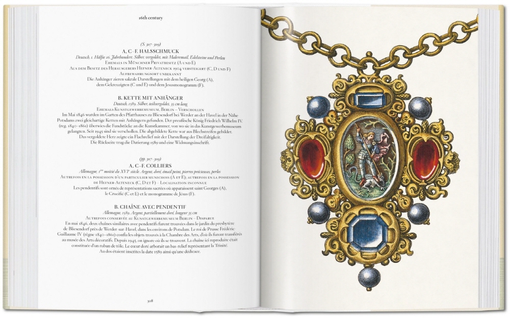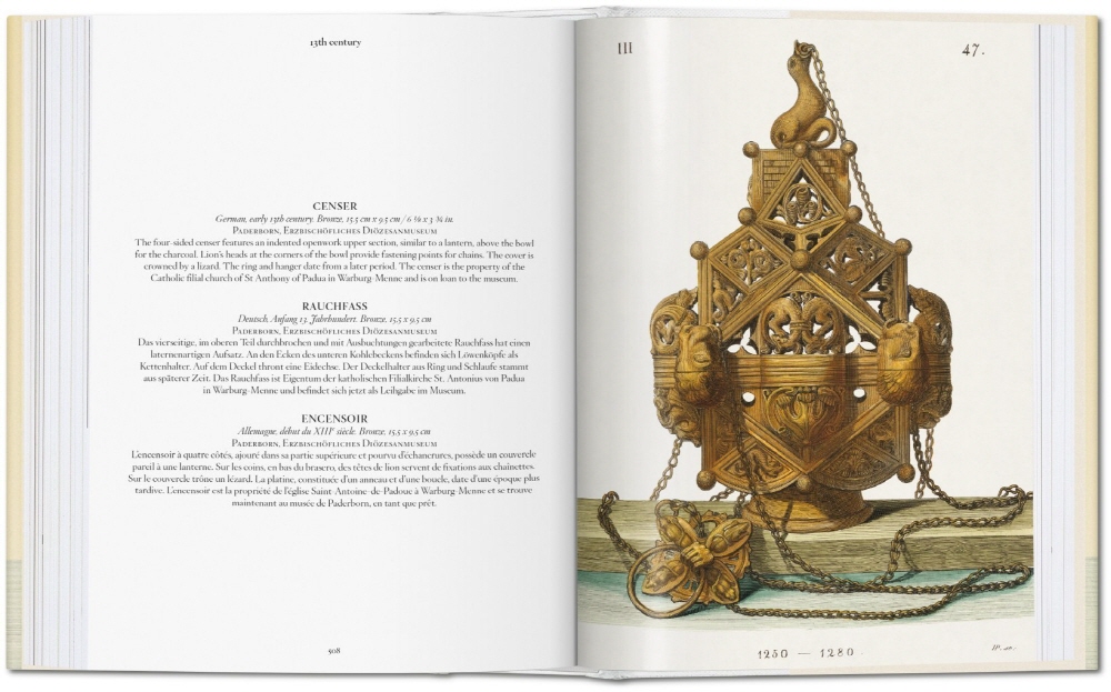 When Kunstwerke und Geräthschaften des Mittelalters und der Renaissance (1852–1863) was published, what purchasers in fact bought was a printed museum. With 216 hand-colored copperplate engravings, the publication gives a comprehensive overview of applied arts in Europe from the 9th to the 16th centuries, spanning furniture, metalwork, jewelry, tapestries, and bookbinding.