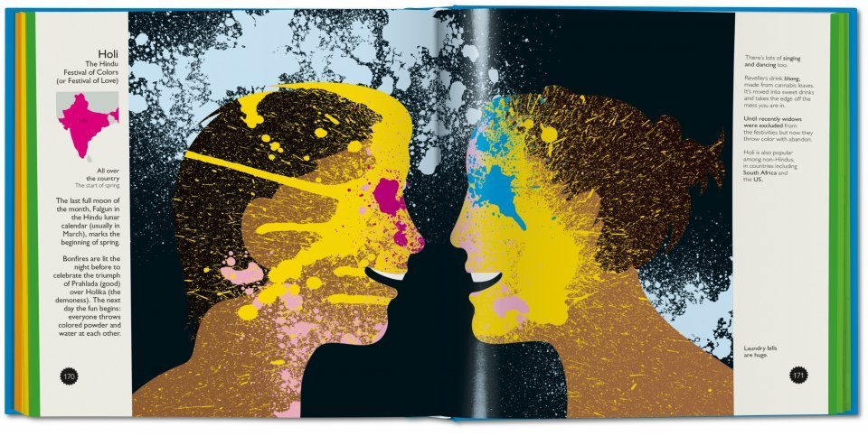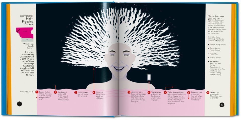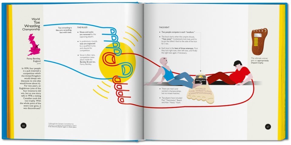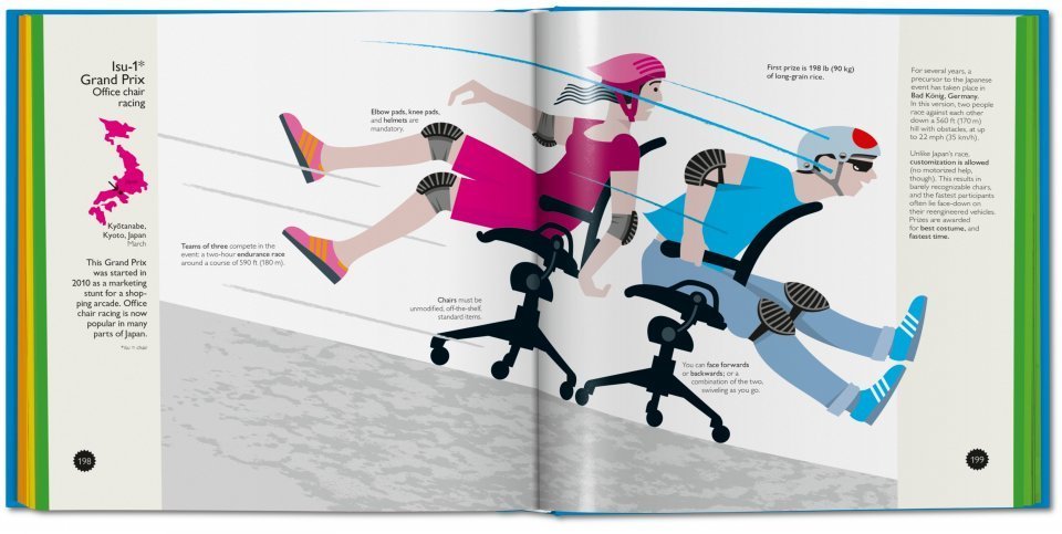 Whether it¡¯s flinging frozen rats or parading in holly evergreens, racing snails or carrying wives, human beings have long displayed their creativity in wild, odd, and sometimes just wonderful rituals and competitions. To show what lengths we¡¯ll go to uphold our eccentric customs, British American graphic designer Nigel Holmes channels his belief in the power of hilarity to bring together a bewilderingly funny tour around the globe in search of incredible events, all dryly explained with brilliant infographics.