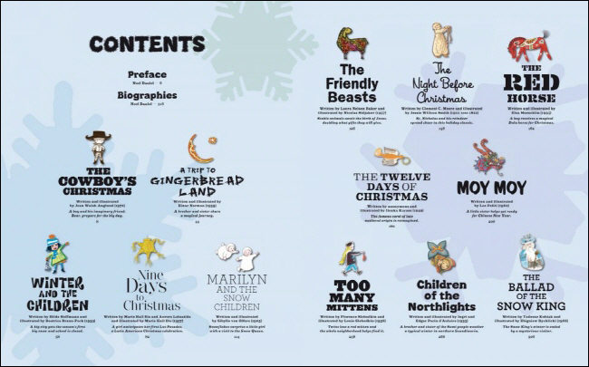 A Treasury of Wintertime TalesÀº 1823³â-1972³âµµ±îÁö 13°¡ÁöÀÇ Ç³ºÎÇÏ°í ´Ù¾çÇÑ °Ü¿ï À̾߱âµé¿¡ ´ëÇØ °¨»çÀÇ ¶æÀ» Ç¥ÇÑ´Ù. ¹Ì±¹, µ¶ÀÏ, Çë°¡¸®, ÀÌÅ»¸®¾Æ, ¸ß½ÃÄÚ, ³ë¸£¿þÀÌ, ·¯½Ã¾Æ¿Í ½º¿þµ§ Ãâ½ÅÀÇ ÀúÀÚ¿Í ÀÏ·¯½ºÆ®·¹ÀÌÅ͸¦ Ư¡À¸·Î, »ì¾Æ³ À峱⠸¹Àº ´«¼ÛÀ̰¡ º¡¾î¸® Àå°©À» ÇÑ Â¦ ÀÒÀº ä, ºÏºÎ ½ºÄµð³ªºñ¾ÆÀÇ »ç¹Ì(Sami)Á·°ú ¿ì¿¬È÷ ¸¶ÁÖÇÏ¿© »õÇØ¸¦ ÃàÇÏÇÏ´Â µîÀÇ ¿©·¯ À̾߱âµéÀ» ´ã°í ÀÖ´Ù.