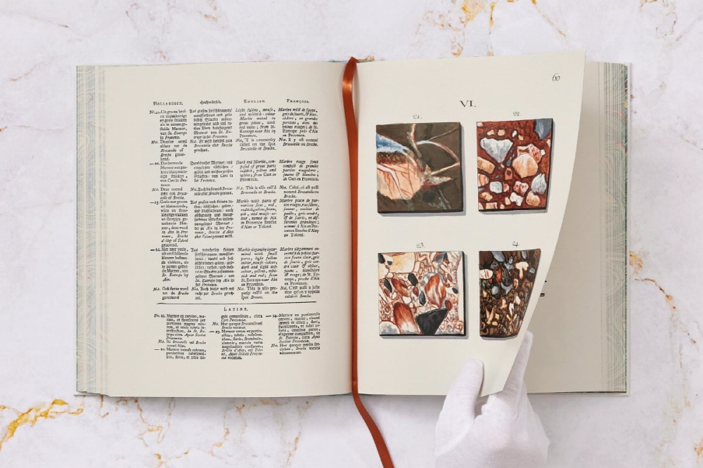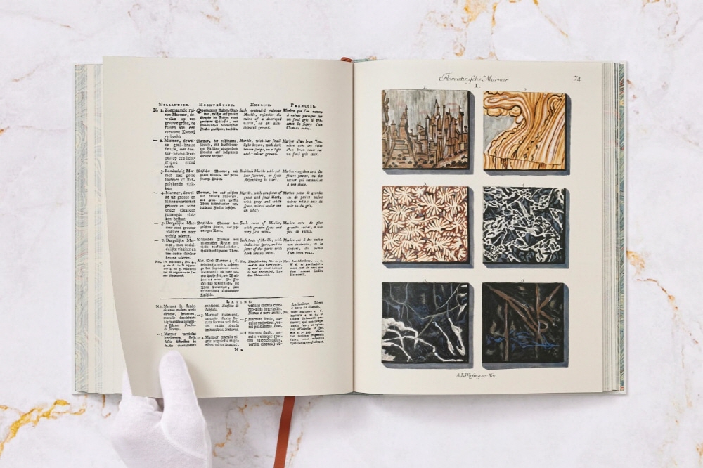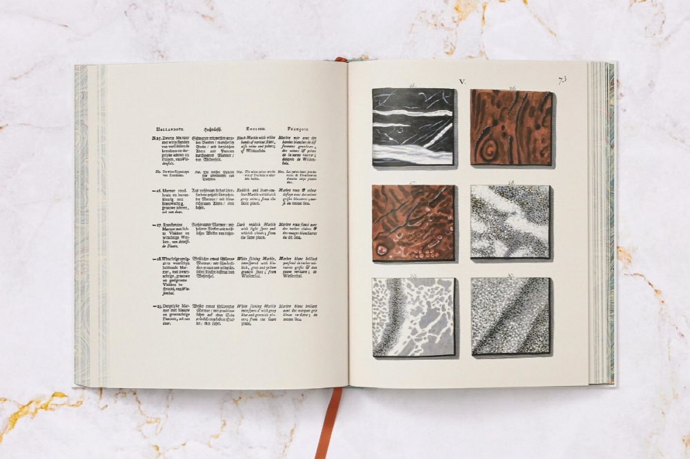 An exhaustive compendium of marble, Afbeelding der Marmor Soorten (A Representation of Marble Types) depicted 570 samples across 100 colour plates, accompanied by texts in five languages. Published in 1776 at the peak of the Enlightenment, it is regarded, rightly, as one of the finest illustrated scientific books of the era.