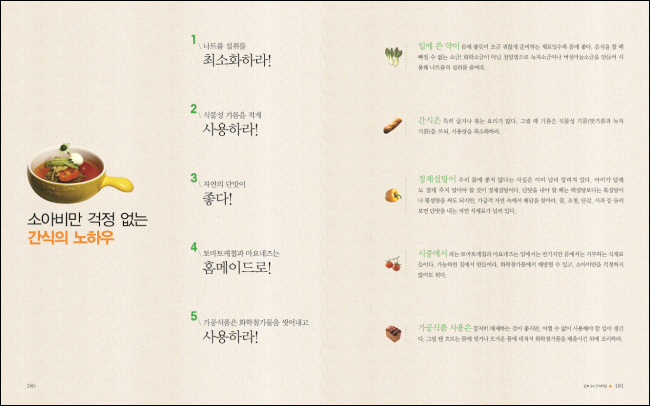 ¼Ò¾Æºñ¸¸À» ÁÙÀÏ ¼ö ÀÖ´Â °£½Ä ¿ä¸® ºñ¹ýÀÌ µé¾îÀÖ´Ù. ¾ÆÀÌ ÀÔ¸À¿¡ ¸ÂÃß´À¶ó ÀÚÄ©ÇÏ¸é ³Ê¹« °í¿·®ÀÌ µÉ ¼ö ÀÖ´Â ¿ÀÈÄ °£½ÄÀ» °úÀϰú ÇÔ²² Èæ¹Ì, µµÅ丮, °í±¸¸¶ µîÀ» ÀÌ¿ëÇØ °Ç°ÇÏ¸é¼ ÁöÄ£ ¸öÀ» ȸº¹½ÃÄÑÁÙ ¼ö ÀÖµµ·Ï ÇÑ´Ù.
