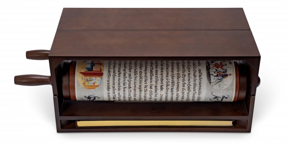 ¡Ú Richly illustrated continuous text, 6.5 m (over 21 ft) long, unfurls right to left from a leather-bound cylinder