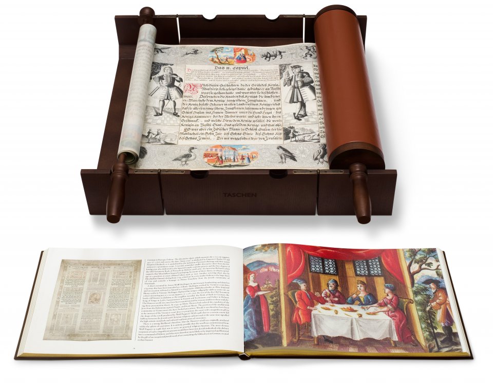 TASCHEN¡¯s facsimile of the Esther scroll is a major achievement in publishing history. It is produced from the very fine manuscript scroll held by the Gottfried Wilhelm Leibniz Bibliothek in Hanover, dated 1746 and measuring 6.5 meters long. This particular megillah is stunning not only in terms of its lavish illuminations but also because it contains a contemporary German version of the story of Esther. For many centuries, the creator of the Hanover scroll was unknown. Piecing together information from various sources, and performing his own stylistic analysis of this and other works of art from the period, author Falk Wiesemann recently made an enthralling discovery: the artist of the Hanover scroll was Wolf Leib Katz Poppers, a Jewish scribe and illustrator from Hildesheim.