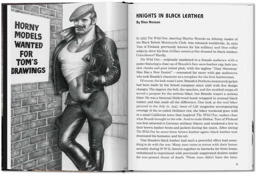 In 1953 Marlon Brando donned a black leather Perfecto motorcycle jacket, military cap, denim jeans, and engineer boots to portray Johnny, sneering leader of the Black Rebel Motorcycle Club, in The Wild One. In 1954 Tom of Finland abandoned brown leather in his artwork to create his own wild ones: muscular, hyper-masculine, black leather-clad rebels with powerful engines between their legs. The look was adopted by the Satyrs Motorcycle Club, the first gay outlaw club, that same year, making Tom¡¯s fantasy world reality. Of course, being Tom, he soon customized his new gay icons, adding leather jodhpurs, knee high boots and leather caps, and every motorcycle bore the brand name ¡°Tom¡± on the gas tank.