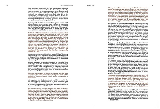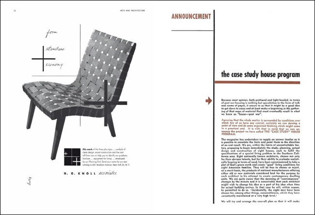 2Â÷ ¼¼°è´ëÀüÀÇ Á¾ÀüºÎÅÍ 1960³â´ë Á߹ݱîÁö ¹Ì±¹ °ÇÃà¿¡´Â Èï¹Ì·Î¿î »ç°ÇµéÀÌ ¹ú¾îÁ³´Ù. ¶°¿À¸£´Â Àç´ÉÀÖ´Â »ç¶÷µéÀÌ Çö´ëÀû µðÀÚÀΰú Àúºñ¿ë Àç·á¸¦ ÅëÇÕÇÏ´Â Çõ½ÅÀûÀÎ ÇÁ·ÎÁ§Æ®¿¡ ÁýÁßÇϱ⠽ÃÀÛÇÑ °ÍÀÌ´Ù. ÀÌ Æ®·»µå´Â ´ç´ëÀÇ ´ëÇ¥ÀûÀÎ ¹Ì±¹ ÀâÁö ¡°¿¹¼ú°ú °ÇÃà(Arts & Architecture)¡±ÀÌ ¹úÀÎ Çö´ëÀû °ÅÁÖ¸¦ À§ÇÑ Ã»»çÁø, ¡°ÄÉÀ̽º ½ºÅ͵ð ÇϿ콺 ÇÁ·Î±×·¥(Case Study House Program)¡± Ä·ÆäÀÎÀ¸·Î ´ëÇ¥µÈ´Ù.