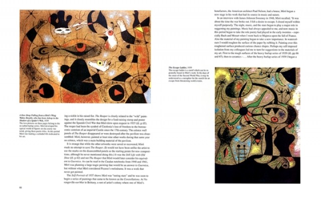 Nineteen forty four saw the beginning of his extensive graphic oeuvre, ceramics, monumental mural works, and sculptures. In these works, too, the Catalan artist sought the solid foundation of a figurative, symbolic art with orientation as regards content: faces, stars, moons, rudimentary animal forms, letters. Joan Miro developed in several stages his characteristic flowing calligraphic style and his world of forms resembling shorthand symbols.