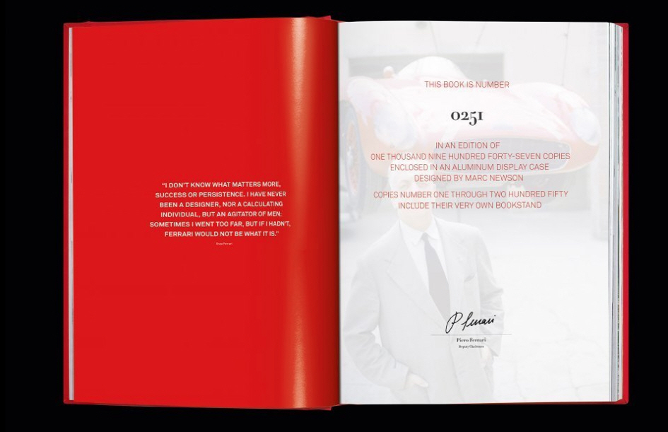 ¾ÆÆ® ¿¡µð¼Ç(No. 1-250)Àº ¸¶Å© ´º½¼(Marc Newson)ÀÌ Á¦ÀÛÇÑ ºÏ ½ºÅĵ带 ÇÔ²² Á¦°øÇϸç, °¢ ±Ç¸¶´Ù ¼³¸³ÀÚ ¿£ÃÊ Æä¶ó¸®ÀÇ ¾ÆµéÀÌÀÚ Æä¶ó¸®ÀÇ ºÎȸÀåÀÎ ÇÇ¿¡·Î Æä¶ó¸®(Piero Ferrari), Æä¶ó¸® ȸÀå ¼¼¸£Áö¿À ¸¶¸£Ä¡¿À³× (Sergio Marchionne), ±×¸®°í ºÎȸÀå Á¸ ¿¤Ä­(John Elkann)ÀÇ »çÀÎÀÌ ´ã°ÜÀÖ´Ù.