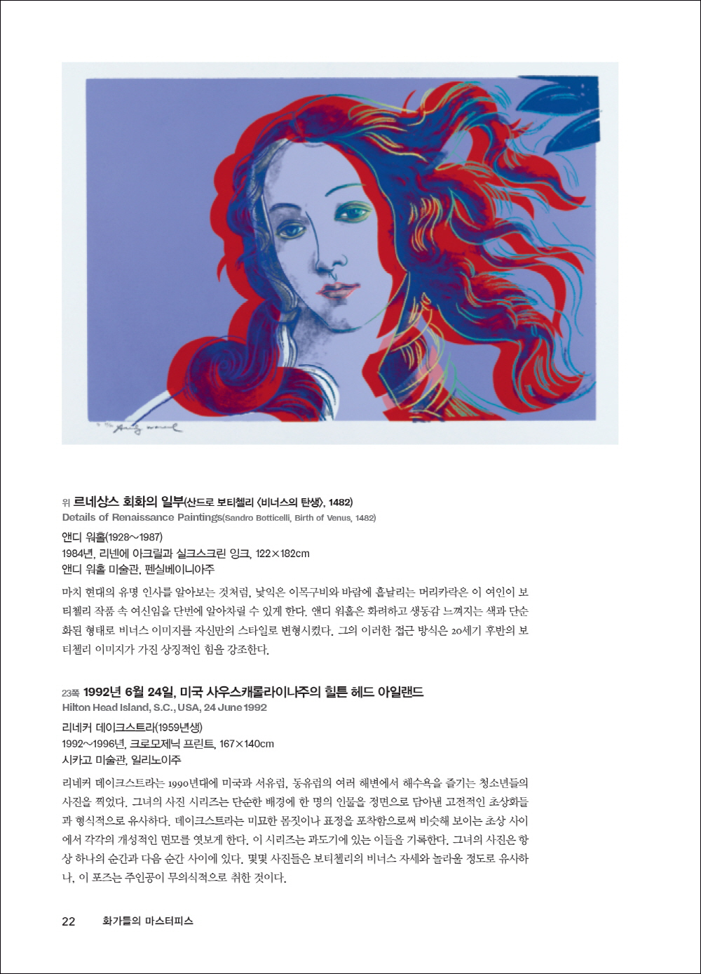 ¡ºÈ°¡µéÀÇ ¸¶½ºÅÍÇǽº¡»¿¡´Â »êµå·Î º¸Æ¼Ã¿¸®ÀÇ <ºñ³Ê½ºÀÇ Åº»ý>À» ½ÃÀÛÀ¸·Î ¾Øµð ¿öȦÀÇ <Ä·º§ ¼öÇÁ ĵ>, ¿¡ÀÌ¹Ì ¼Î·²µåÀÇ <¹Ì¼Ð ¿À¹Ù¸¶ ÃÊ»óÈ>±îÁö, ¸¹Àº Àα⸦ ´©¸®°í ºñÆò°¡µéÀÇ È£ÆòÀ» ¹ÞÀº Ä£¼÷ÇÑ ±×¸²µéÀÌ µîÀåÇÑ´Ù. ÀÌ ÀÛǰµéÀÌ Áö±ÝÀÇ ¸í¼ºÀ» °®°Ô µÈ ±æÀ» ¿ÂÀüÈ÷ »ìÇǰíÀÚ °¢ ±×¸²ÀÇ °ú°Å¸¦ »ìÆìº¸°í, »ó¡ÀûÀÎ À̹ÌÁö µÚ¿¡ ¼û°ÜÁø À̾߱⸦ ã¾Æ³½´Ù. ¿ì¸®¿¡°Ô ÀÍÈ÷ ¾Ë·ÁÁø Ȱ¡µéÀÌ ¸í¼ºÀ» ¾ò°Ô µÈ ±æÀº Àýµµ, ½ºÄµµé, ¹ýÀû ºÐÀï, Á¤Ä¡±Ç·Â µîÀ¸·Î °¡µæÇÏ´Ù. ÀÌ Ã¥Àº ¸íȰ¡ ¸¸µé¾îÁö´Â ȯ°æ°ú ¸í¼ºÀÌ ³ô¾ÆÁö´Â °úÁ¤À» ÀçÁ¶¸íÇØ ÇöÀç À§´ëÇÏ´Ù°í ÀÏÄþîÁö´Â ÀÛǰÀ» ÀÌÇØÇÏ°í °¨»óÇÏ´Â »õ·Î¿î Á¢±Ù¹ýÀ» Á¦°øÇÑ´Ù. ¼¼°è¿¡¼ °¡Àå À¯¸íÇÑ ÀÛǰ¿¡ ´ã±ä ¸ÅȤÀûÀÎ À̾߱⸦ »ìÆìº¸´Â °úÁ¤À» ÅëÇØ µ¶ÀÚµéÀº ÀÌÁ©¿¡¼ ´ëÁßÀÇ È¯È£ ¼ÓÀ¸·Î °¡´Â ¿©Á¤ÀÌ ¸íÈ ±× ÀÚü¸¸Å ¸Å·ÂÀûÀÏ ¼ö ÀÖÀ½À» ±ú´Ý°Ô µÈ´Ù.